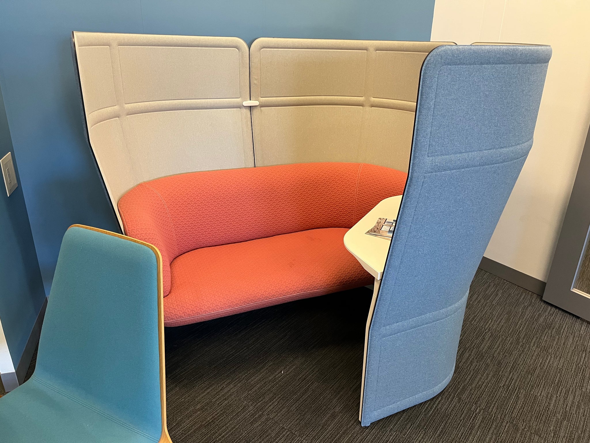 Openest retreat office booth has a combination of Feather sofa and connected Plume screens meant for private interaction or focused work.